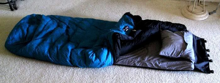 Ten+ years ago, I stumbled across a down sleeping bag made by Marmot where the bottom of it is an eggshell sleeping pad and the top is a down bag. The theory is that you're really only insulated on the top so you only need half a sleeping bag. And, since it zips to the pad, you don't wake up in the middle of the night slipped off of your sleeping pad. Did I mention it also has a pocket to hold your pillow in place? (Or stuffed full of clothes for a pillow substitute.) Better yet, the sleeve for the pad is machine washable so your sleeping bag doesn't get all stinky.
