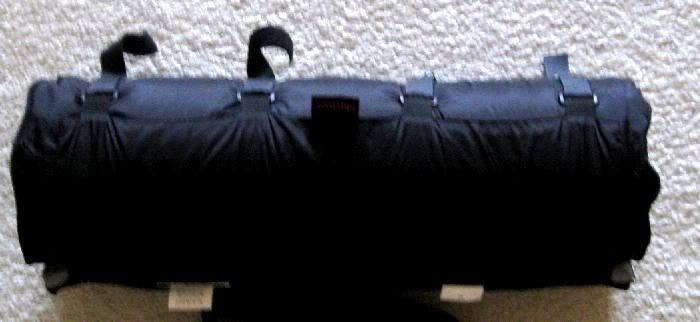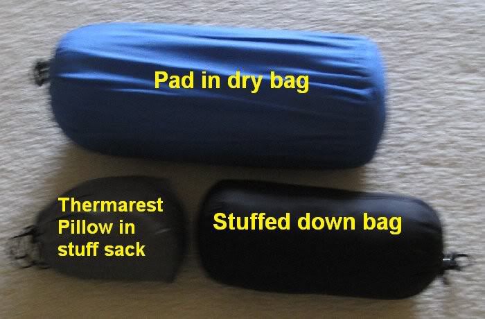 Here's my whole camp in the waterproof duffel: Tent, ground cloth, lightweight nylon tarp to cover the bike at night, sleeping bag, sleeping pad, Thermarest pillow and pack towel. (A Pack Towel is a lightweight, small to pack, quick drying synthetic towel available from REI and other places.)