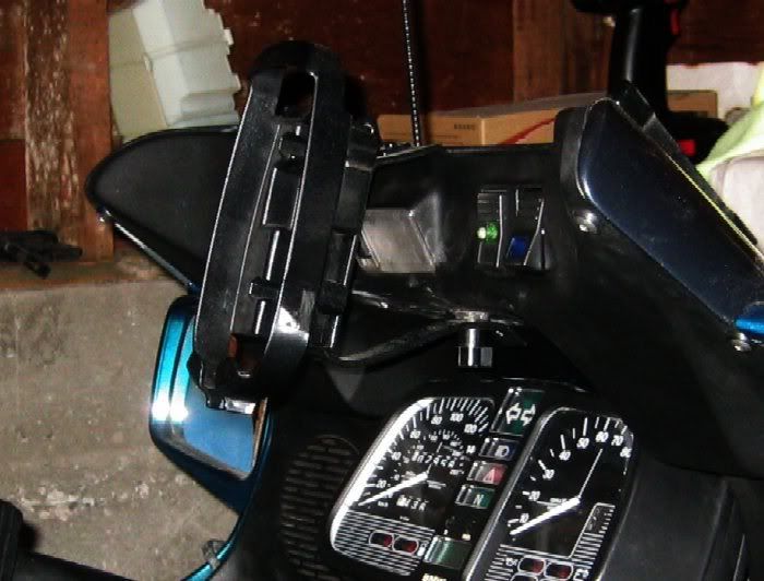 Here's how I mount my Magellan Meridian. The top part has a right angle in it and slips into the seam at the top of the fairing. The bottom mounts to a nut mounting I put in the inner dash and sercues with a knob. I also added a 12V jack and power it from the bike with an auto cord that I pleaced the end of with a 1/4" mono plug. To hold it, I just bought the RAM Mount holder for it.