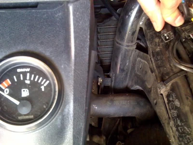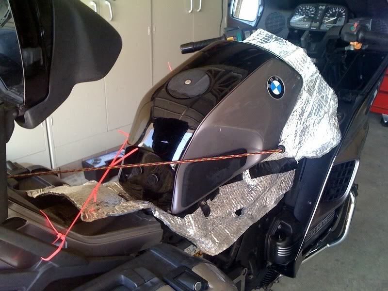 3) Lift gas tank up and back & hold in place with bungee or tie wrap. The silver foil you see in the pic is my Johnny Blanket for heat control. Search this site if you're interested in it.