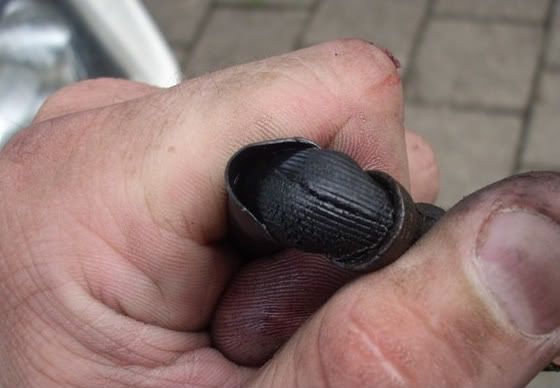 ookay, Suddenly one caliper gives as some brake fluid gets out. The gunkiest, nasties brake fluid I ever saw, filled with little rubber bits.. Ah, the interior of the brake hose must have degraded over time.
