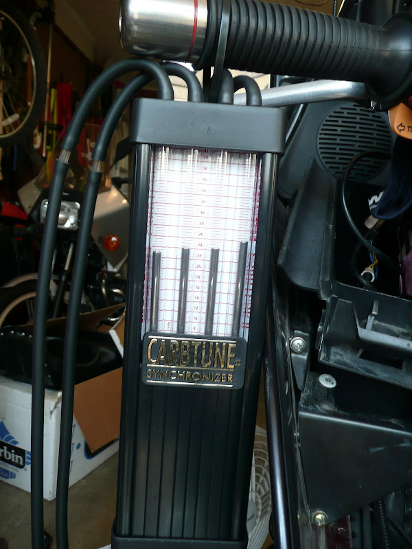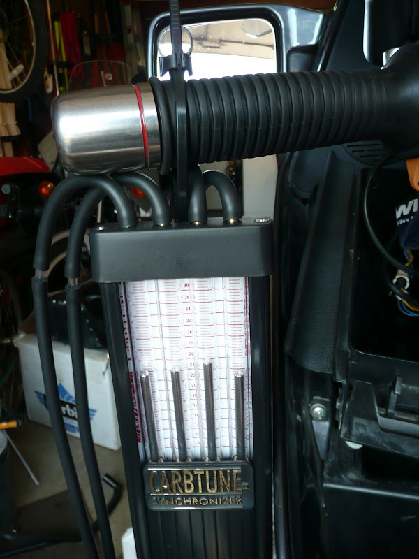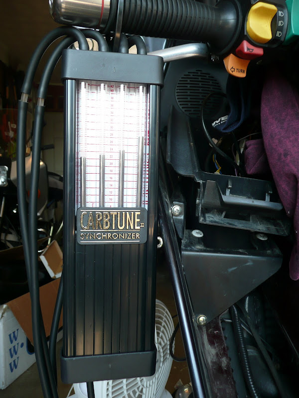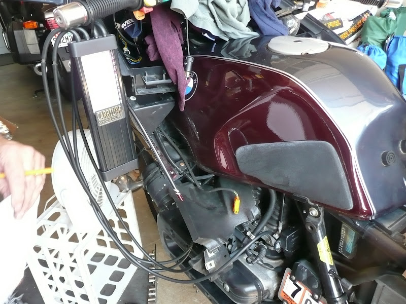 I initially wanted to do a comparison between Rich's Carbtune and my Carbmate - but my battery died. I plugged my ChargX in, but it's too slow. We connected Rich's battery charger and got the bike running again.